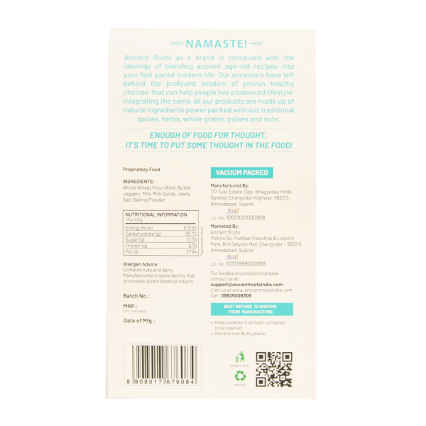 - Jeera Cookies made with all the healthy & gut-friendly ingredients like Whole Wheat Flour (Atta), White Butter, Jaggery, Milk, Milk Solids, Jeera(Cumin), & Salt.