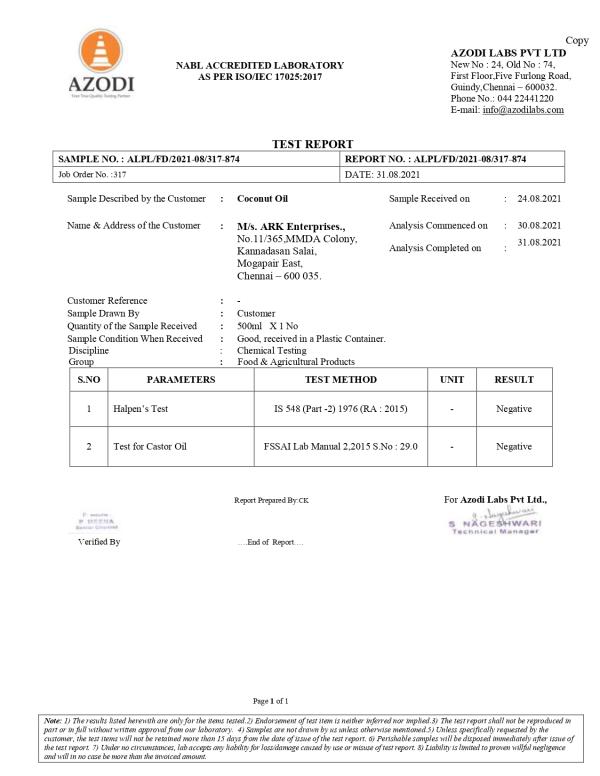 Ark’s Arogiyam Food Products – Coconut oil is a premium product produced keeping the health of our customers in mind. Our Coconut oil is pure, lab tested, Sulphur Free and very traditionally prepared. With over 30 years of field experience, we are specialized in cooking oils and we know the importance of providing good, healthy and trust worthy products to our customers.