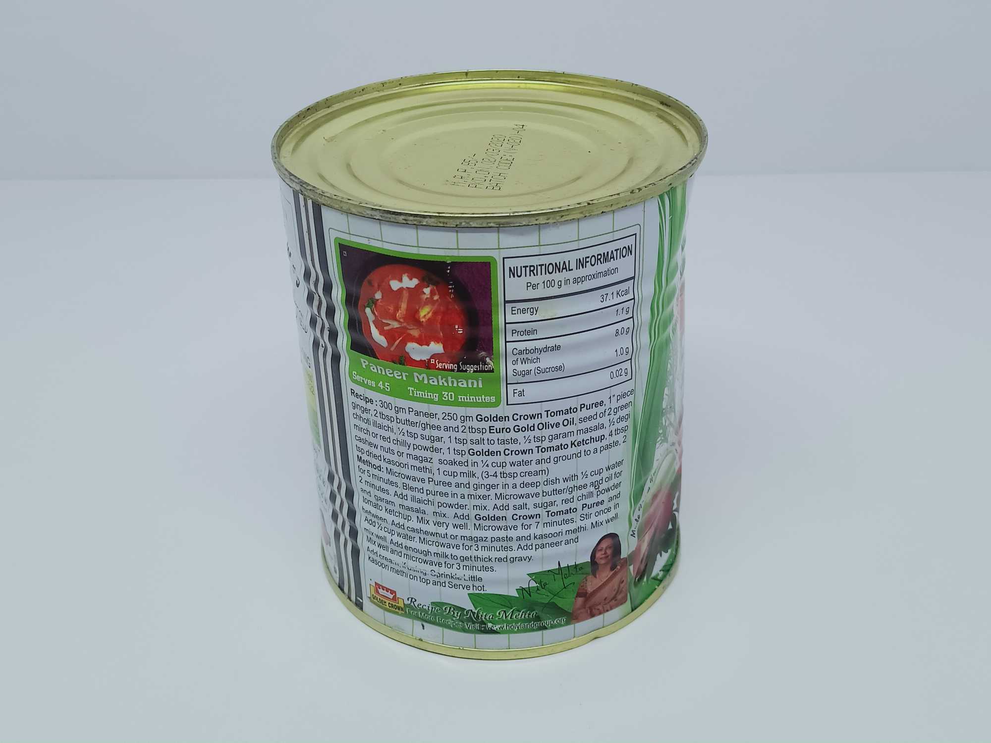 Method: Microwave Puree and ginger in a deep dish with 1/2 cup water for 5 minutes. Blend puree in a mixer. Microwave butter/ghee and oil for 2 minutes. Add illaichi powder. mix. Add salt, sugar, red chilli powder and garam masala. mix. Add Golden Crown Tomato Puree and tomato ketchup. Mix very well. Microwave for 7 minutes, Stir once in between. Add cashewnut or magaz paste and kasoori methi. Mix well. Add 1/2 cup water. Microwave for 3 minutes. Add paneer and Mix well and microwave for 3 minutes.
