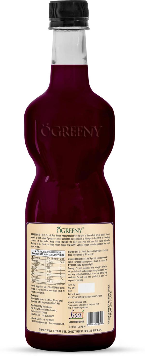 Ogreeny jamun vinegar is prepared from the fleshy fruit jamun which is also called as black plum syzygium cumini . This vinegar finds exceptional benefits for digestive system. It has cooling, digestive, carminative, stomachic and diuretic properties.